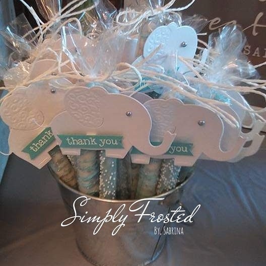 Party favors do not always have to be mints. You can order pretzel rods, cake pops, cookies, cupcakes and more... It's all about the presentation. These pretzel rods were the star of the show! Adorable tags made by the amazing Lori Barnett! Check her out... click here. Contact me to order a special treat for your special event.